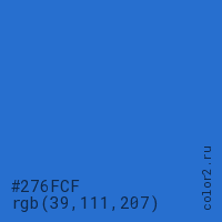 Цвет #276FCF в цветовой модели RGB обозначается тремя октетами (39, 111, 207) в десятичном формате и #276FCF в шестнадцатиричном (hex) формате, которые являются интенсивностью красного 39 (hex 27), интенсивность зелёного 111 (hex 6F) и интенсивность синего 207 (hex CF).