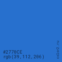 Цвет #2770CE в цветовой модели RGB обозначается тремя октетами (39, 112, 206) в десятичном формате и #2770CE в шестнадцатиричном (hex) формате, которые являются интенсивностью красного 39 (hex 27), интенсивность зелёного 112 (hex 70) и интенсивность синего 206 (hex CE).