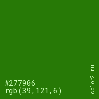 Цвет #277906 в цветовой модели RGB обозначается тремя октетами (39, 121, 6) в десятичном формате и #277906 в шестнадцатиричном (hex) формате, которые являются интенсивностью красного 39 (hex 27), интенсивность зелёного 121 (hex 79) и интенсивность синего 6 (hex 06).