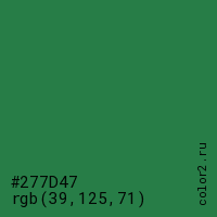 Цвет #277D47 в цветовой модели RGB обозначается тремя октетами (39, 125, 71) в десятичном формате и #277D47 в шестнадцатиричном (hex) формате, которые являются интенсивностью красного 39 (hex 27), интенсивность зелёного 125 (hex 7D) и интенсивность синего 71 (hex 47).