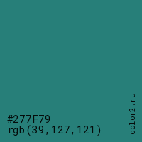 Цвет #277F79 в цветовой модели RGB обозначается тремя октетами (39, 127, 121) в десятичном формате и #277F79 в шестнадцатиричном (hex) формате, которые являются интенсивностью красного 39 (hex 27), интенсивность зелёного 127 (hex 7F) и интенсивность синего 121 (hex 79).