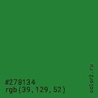 Цвет #278134 в цветовой модели RGB обозначается тремя октетами (39, 129, 52) в десятичном формате и #278134 в шестнадцатиричном (hex) формате, которые являются интенсивностью красного 39 (hex 27), интенсивность зелёного 129 (hex 81) и интенсивность синего 52 (hex 34).