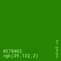 Цвет #278402 в цветовой модели RGB обозначается тремя октетами (39, 132, 2) в десятичном формате и #278402 в шестнадцатиричном (hex) формате, которые являются интенсивностью красного 39 (hex 27), интенсивность зелёного 132 (hex 84) и интенсивность синего 2 (hex 02).
