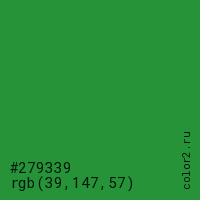 Цвет #279339 в цветовой модели RGB обозначается тремя октетами (39, 147, 57) в десятичном формате и #279339 в шестнадцатиричном (hex) формате, которые являются интенсивностью красного 39 (hex 27), интенсивность зелёного 147 (hex 93) и интенсивность синего 57 (hex 39).