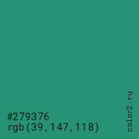 Цвет #279376 в цветовой модели RGB обозначается тремя октетами (39, 147, 118) в десятичном формате и #279376 в шестнадцатиричном (hex) формате, которые являются интенсивностью красного 39 (hex 27), интенсивность зелёного 147 (hex 93) и интенсивность синего 118 (hex 76).