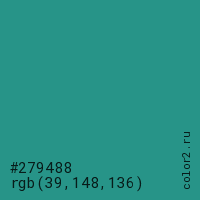 Цвет #279488 в цветовой модели RGB обозначается тремя октетами (39, 148, 136) в десятичном формате и #279488 в шестнадцатиричном (hex) формате, которые являются интенсивностью красного 39 (hex 27), интенсивность зелёного 148 (hex 94) и интенсивность синего 136 (hex 88).