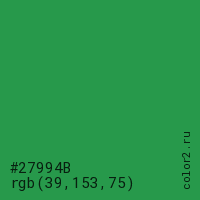 Цвет #27994B в цветовой модели RGB обозначается тремя октетами (39, 153, 75) в десятичном формате и #27994B в шестнадцатиричном (hex) формате, которые являются интенсивностью красного 39 (hex 27), интенсивность зелёного 153 (hex 99) и интенсивность синего 75 (hex 4B).