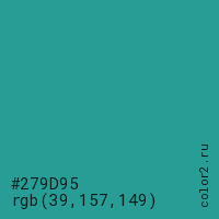 Цвет #279D95 в цветовой модели RGB обозначается тремя октетами (39, 157, 149) в десятичном формате и #279D95 в шестнадцатиричном (hex) формате, которые являются интенсивностью красного 39 (hex 27), интенсивность зелёного 157 (hex 9D) и интенсивность синего 149 (hex 95).