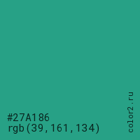 Цвет #27A186 в цветовой модели RGB обозначается тремя октетами (39, 161, 134) в десятичном формате и #27A186 в шестнадцатиричном (hex) формате, которые являются интенсивностью красного 39 (hex 27), интенсивность зелёного 161 (hex A1) и интенсивность синего 134 (hex 86).