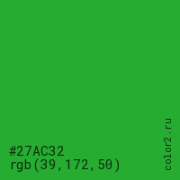 Цвет #27AC32 в цветовой модели RGB обозначается тремя октетами (39, 172, 50) в десятичном формате и #27AC32 в шестнадцатиричном (hex) формате, которые являются интенсивностью красного 39 (hex 27), интенсивность зелёного 172 (hex AC) и интенсивность синего 50 (hex 32).