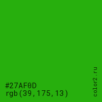 Цвет #27AF0D в цветовой модели RGB обозначается тремя октетами (39, 175, 13) в десятичном формате и #27AF0D в шестнадцатиричном (hex) формате, которые являются интенсивностью красного 39 (hex 27), интенсивность зелёного 175 (hex AF) и интенсивность синего 13 (hex 0D).
