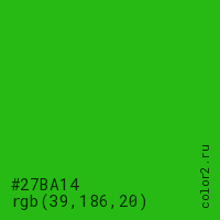 Цвет #27BA14 в цветовой модели RGB обозначается тремя октетами (39, 186, 20) в десятичном формате и #27BA14 в шестнадцатиричном (hex) формате, которые являются интенсивностью красного 39 (hex 27), интенсивность зелёного 186 (hex BA) и интенсивность синего 20 (hex 14).