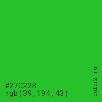 Цвет #27C22B в цветовой модели RGB обозначается тремя октетами (39, 194, 43) в десятичном формате и #27C22B в шестнадцатиричном (hex) формате, которые являются интенсивностью красного 39 (hex 27), интенсивность зелёного 194 (hex C2) и интенсивность синего 43 (hex 2B).