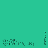 Цвет #27C695 в цветовой модели RGB обозначается тремя октетами (39, 198, 149) в десятичном формате и #27C695 в шестнадцатиричном (hex) формате, которые являются интенсивностью красного 39 (hex 27), интенсивность зелёного 198 (hex C6) и интенсивность синего 149 (hex 95).