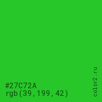 Цвет #27C72A в цветовой модели RGB обозначается тремя октетами (39, 199, 42) в десятичном формате и #27C72A в шестнадцатиричном (hex) формате, которые являются интенсивностью красного 39 (hex 27), интенсивность зелёного 199 (hex C7) и интенсивность синего 42 (hex 2A).