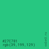 Цвет #27C781 в цветовой модели RGB обозначается тремя октетами (39, 199, 129) в десятичном формате и #27C781 в шестнадцатиричном (hex) формате, которые являются интенсивностью красного 39 (hex 27), интенсивность зелёного 199 (hex C7) и интенсивность синего 129 (hex 81).