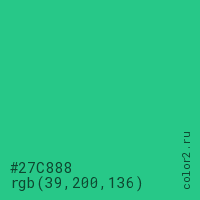 Цвет #27C888 в цветовой модели RGB обозначается тремя октетами (39, 200, 136) в десятичном формате и #27C888 в шестнадцатиричном (hex) формате, которые являются интенсивностью красного 39 (hex 27), интенсивность зелёного 200 (hex C8) и интенсивность синего 136 (hex 88).