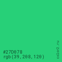 Цвет #27D078 в цветовой модели RGB обозначается тремя октетами (39, 208, 120) в десятичном формате и #27D078 в шестнадцатиричном (hex) формате, которые являются интенсивностью красного 39 (hex 27), интенсивность зелёного 208 (hex D0) и интенсивность синего 120 (hex 78).