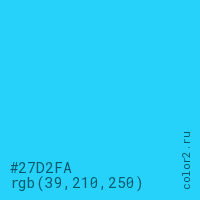 Цвет #27D2FA в цветовой модели RGB обозначается тремя октетами (39, 210, 250) в десятичном формате и #27D2FA в шестнадцатиричном (hex) формате, которые являются интенсивностью красного 39 (hex 27), интенсивность зелёного 210 (hex D2) и интенсивность синего 250 (hex FA).