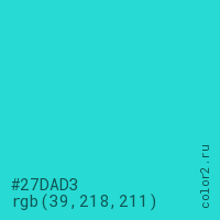 Цвет #27DAD3 в цветовой модели RGB обозначается тремя октетами (39, 218, 211) в десятичном формате и #27DAD3 в шестнадцатиричном (hex) формате, которые являются интенсивностью красного 39 (hex 27), интенсивность зелёного 218 (hex DA) и интенсивность синего 211 (hex D3).