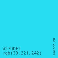 Цвет #27DDF2 в цветовой модели RGB обозначается тремя октетами (39, 221, 242) в десятичном формате и #27DDF2 в шестнадцатиричном (hex) формате, которые являются интенсивностью красного 39 (hex 27), интенсивность зелёного 221 (hex DD) и интенсивность синего 242 (hex F2).