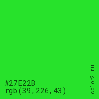 Цвет #27E22B в цветовой модели RGB обозначается тремя октетами (39, 226, 43) в десятичном формате и #27E22B в шестнадцатиричном (hex) формате, которые являются интенсивностью красного 39 (hex 27), интенсивность зелёного 226 (hex E2) и интенсивность синего 43 (hex 2B).