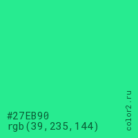 Цвет #27EB90 в цветовой модели RGB обозначается тремя октетами (39, 235, 144) в десятичном формате и #27EB90 в шестнадцатиричном (hex) формате, которые являются интенсивностью красного 39 (hex 27), интенсивность зелёного 235 (hex EB) и интенсивность синего 144 (hex 90).