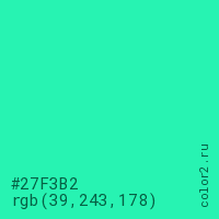 Цвет #27F3B2 в цветовой модели RGB обозначается тремя октетами (39, 243, 178) в десятичном формате и #27F3B2 в шестнадцатиричном (hex) формате, которые являются интенсивностью красного 39 (hex 27), интенсивность зелёного 243 (hex F3) и интенсивность синего 178 (hex B2).