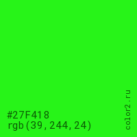 Цвет #27F418 в цветовой модели RGB обозначается тремя октетами (39, 244, 24) в десятичном формате и #27F418 в шестнадцатиричном (hex) формате, которые являются интенсивностью красного 39 (hex 27), интенсивность зелёного 244 (hex F4) и интенсивность синего 24 (hex 18).