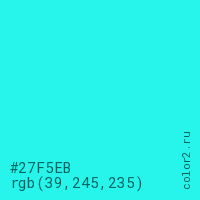 Цвет #27F5EB в цветовой модели RGB обозначается тремя октетами (39, 245, 235) в десятичном формате и #27F5EB в шестнадцатиричном (hex) формате, которые являются интенсивностью красного 39 (hex 27), интенсивность зелёного 245 (hex F5) и интенсивность синего 235 (hex EB).