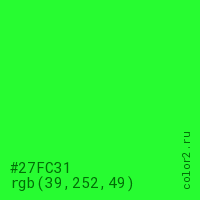 Цвет #27FC31 в цветовой модели RGB обозначается тремя октетами (39, 252, 49) в десятичном формате и #27FC31 в шестнадцатиричном (hex) формате, которые являются интенсивностью красного 39 (hex 27), интенсивность зелёного 252 (hex FC) и интенсивность синего 49 (hex 31).