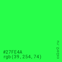 Цвет #27FE4A в цветовой модели RGB обозначается тремя октетами (39, 254, 74) в десятичном формате и #27FE4A в шестнадцатиричном (hex) формате, которые являются интенсивностью красного 39 (hex 27), интенсивность зелёного 254 (hex FE) и интенсивность синего 74 (hex 4A).