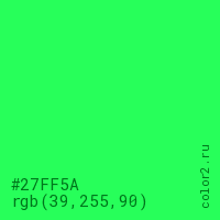 Цвет #27FF5A в цветовой модели RGB обозначается тремя октетами (39, 255, 90) в десятичном формате и #27FF5A в шестнадцатиричном (hex) формате, которые являются интенсивностью красного 39 (hex 27), интенсивность зелёного 255 (hex FF) и интенсивность синего 90 (hex 5A).