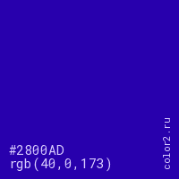 Цвет #2800AD в цветовой модели RGB обозначается тремя октетами (40, 0, 173) в десятичном формате и #2800AD в шестнадцатиричном (hex) формате, которые являются интенсивностью красного 40 (hex 28), интенсивность зелёного 0 (hex 00) и интенсивность синего 173 (hex AD).
