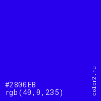 Цвет #2800EB в цветовой модели RGB обозначается тремя октетами (40, 0, 235) в десятичном формате и #2800EB в шестнадцатиричном (hex) формате, которые являются интенсивностью красного 40 (hex 28), интенсивность зелёного 0 (hex 00) и интенсивность синего 235 (hex EB).