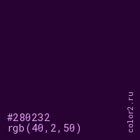 Цвет #280232 в цветовой модели RGB обозначается тремя октетами (40, 2, 50) в десятичном формате и #280232 в шестнадцатиричном (hex) формате, которые являются интенсивностью красного 40 (hex 28), интенсивность зелёного 2 (hex 02) и интенсивность синего 50 (hex 32).