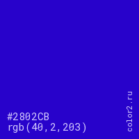 Цвет #2802CB в цветовой модели RGB обозначается тремя октетами (40, 2, 203) в десятичном формате и #2802CB в шестнадцатиричном (hex) формате, которые являются интенсивностью красного 40 (hex 28), интенсивность зелёного 2 (hex 02) и интенсивность синего 203 (hex CB).