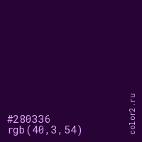 Цвет #280336 в цветовой модели RGB обозначается тремя октетами (40, 3, 54) в десятичном формате и #280336 в шестнадцатиричном (hex) формате, которые являются интенсивностью красного 40 (hex 28), интенсивность зелёного 3 (hex 03) и интенсивность синего 54 (hex 36).