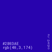 Цвет #2803AE в цветовой модели RGB обозначается тремя октетами (40, 3, 174) в десятичном формате и #2803AE в шестнадцатиричном (hex) формате, которые являются интенсивностью красного 40 (hex 28), интенсивность зелёного 3 (hex 03) и интенсивность синего 174 (hex AE).