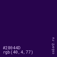 Цвет #28044D в цветовой модели RGB обозначается тремя октетами (40, 4, 77) в десятичном формате и #28044D в шестнадцатиричном (hex) формате, которые являются интенсивностью красного 40 (hex 28), интенсивность зелёного 4 (hex 04) и интенсивность синего 77 (hex 4D).