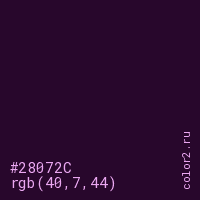 Цвет #28072C в цветовой модели RGB обозначается тремя октетами (40, 7, 44) в десятичном формате и #28072C в шестнадцатиричном (hex) формате, которые являются интенсивностью красного 40 (hex 28), интенсивность зелёного 7 (hex 07) и интенсивность синего 44 (hex 2C).