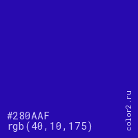 Цвет #280AAF в цветовой модели RGB обозначается тремя октетами (40, 10, 175) в десятичном формате и #280AAF в шестнадцатиричном (hex) формате, которые являются интенсивностью красного 40 (hex 28), интенсивность зелёного 10 (hex 0A) и интенсивность синего 175 (hex AF).