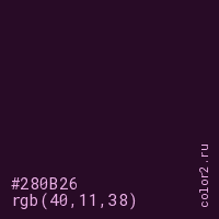 Цвет #280B26 в цветовой модели RGB обозначается тремя октетами (40, 11, 38) в десятичном формате и #280B26 в шестнадцатиричном (hex) формате, которые являются интенсивностью красного 40 (hex 28), интенсивность зелёного 11 (hex 0B) и интенсивность синего 38 (hex 26).