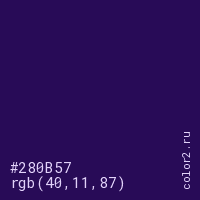 Цвет #280B57 в цветовой модели RGB обозначается тремя октетами (40, 11, 87) в десятичном формате и #280B57 в шестнадцатиричном (hex) формате, которые являются интенсивностью красного 40 (hex 28), интенсивность зелёного 11 (hex 0B) и интенсивность синего 87 (hex 57).