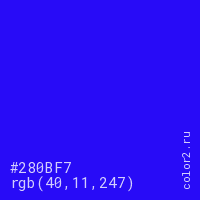 Цвет #280BF7 в цветовой модели RGB обозначается тремя октетами (40, 11, 247) в десятичном формате и #280BF7 в шестнадцатиричном (hex) формате, которые являются интенсивностью красного 40 (hex 28), интенсивность зелёного 11 (hex 0B) и интенсивность синего 247 (hex F7).