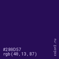 Цвет #280D57 в цветовой модели RGB обозначается тремя октетами (40, 13, 87) в десятичном формате и #280D57 в шестнадцатиричном (hex) формате, которые являются интенсивностью красного 40 (hex 28), интенсивность зелёного 13 (hex 0D) и интенсивность синего 87 (hex 57).