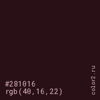 Цвет #281016 в цветовой модели RGB обозначается тремя октетами (40, 16, 22) в десятичном формате и #281016 в шестнадцатиричном (hex) формате, которые являются интенсивностью красного 40 (hex 28), интенсивность зелёного 16 (hex 10) и интенсивность синего 22 (hex 16).