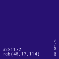 Цвет #281172 в цветовой модели RGB обозначается тремя октетами (40, 17, 114) в десятичном формате и #281172 в шестнадцатиричном (hex) формате, которые являются интенсивностью красного 40 (hex 28), интенсивность зелёного 17 (hex 11) и интенсивность синего 114 (hex 72).