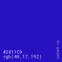 Цвет #2811C0 в цветовой модели RGB обозначается тремя октетами (40, 17, 192) в десятичном формате и #2811C0 в шестнадцатиричном (hex) формате, которые являются интенсивностью красного 40 (hex 28), интенсивность зелёного 17 (hex 11) и интенсивность синего 192 (hex C0).
