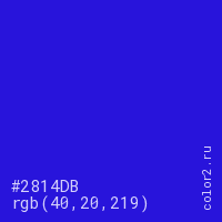 Цвет #2814DB в цветовой модели RGB обозначается тремя октетами (40, 20, 219) в десятичном формате и #2814DB в шестнадцатиричном (hex) формате, которые являются интенсивностью красного 40 (hex 28), интенсивность зелёного 20 (hex 14) и интенсивность синего 219 (hex DB).